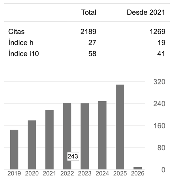 - Indice H=27, índice i10=58 (fuente, Google Scholar a enero 2026, ver abajo gráfico con descripción de citas por año; citas totales=2189, desde 2019, 1269)